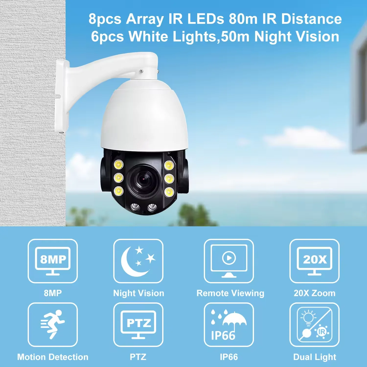 ①8MP 20X Zoom POE IP High Speed PTZ Outdoor/ Indoor Security Camera, 2-ways audio, 6pcs Array IR LEDs,100m IR