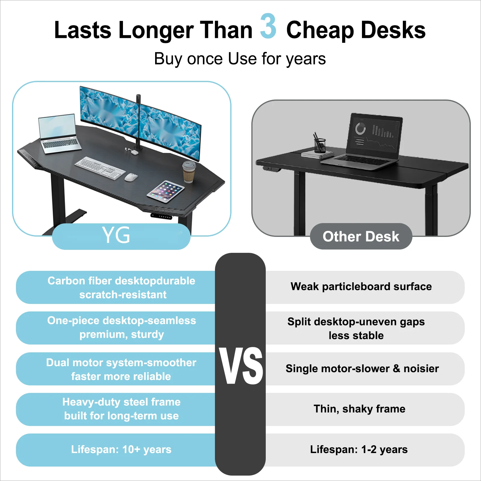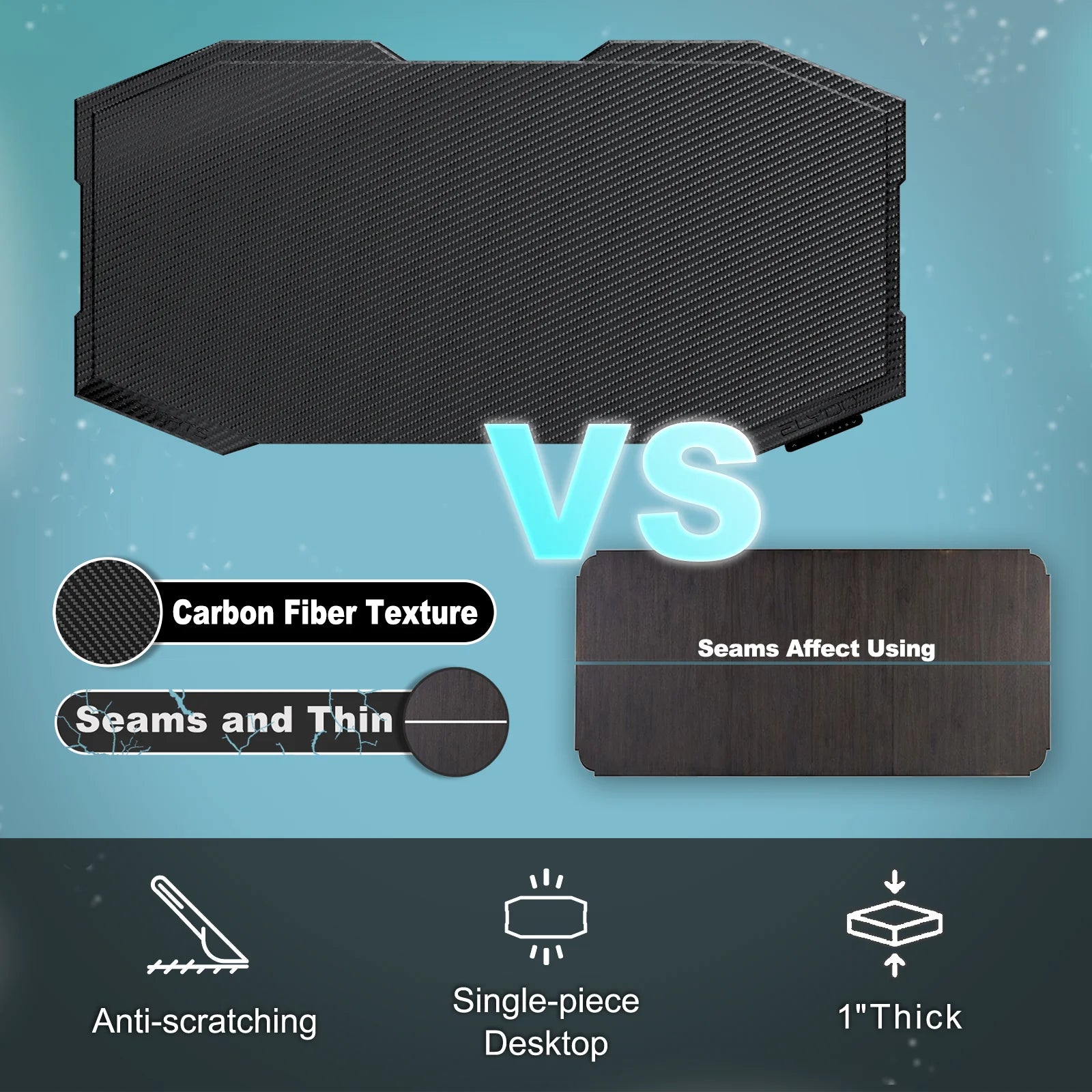 * SPACIOUS ONE-PIECE TABLETOP - Enjoy a seamless 55.12" x 27.56" x 1" carbon fiber surface that’s scratch-resistant and easy to clean. The one-piece design provides a stable and elegant workspace, making it a perfect computer desk for gaming or home office use
