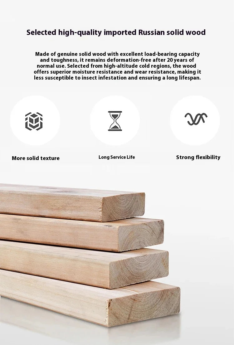 Real wood, good load-bearing capacity and toughness, no deformation, selected from high-altitude regions. Wood is more moisture-proof and wear-resistant, less prone to insect infestation, and has a long service life